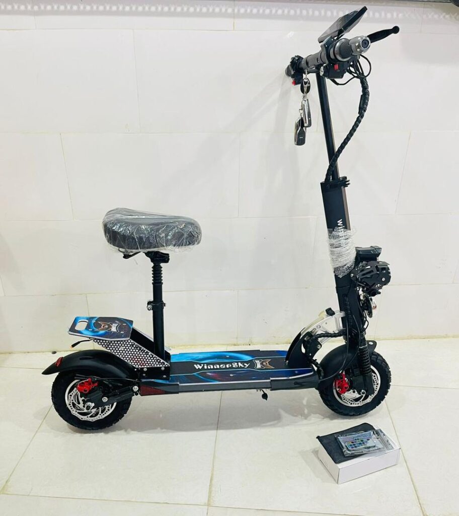 اسکوتربرقی آفرودی وینر اسکای W5 این مدل از اسکوتر برقی از دارای موتور 3000 وات می باشد. که حداثر سرعت آن 70 کیلومتر و مسافت قابل پیمایش با هر بار شارژ آن بین 30 تا 35 کیلومتر می باشد. این دستگاه قابلیت تاشو بودن را دارد. وبه راحتی می توان آن را حمل کرد. کف دستگاه و با پلاستیک شفاف ساخته شده به صورت چند لایه که رقص نور بسیار زیبا با قابلیت کنترل را دارا می باشد.