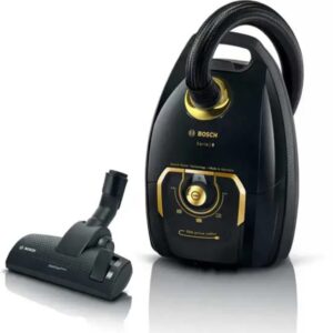 بدنه این دستگاه از پلاستیک بادوام و ضد خش طراحی شده که با ترکیب رنگ مشکی و نوارهای طلایی، جلوه ای خاص به این محصول بخشیده است. البته بخش هایی همچون لوله تلسکوپی جاروبرقی بوش، از جنس استیل ضد زنگ طراحی شده و شیلنگ رابط آن کنفی و بسیار انعطاف پذیر میباشد. وجود لوله کنفی یکی از مزیت های بارز جاروبرقی بوده که از هر گونه سوراخ و پارگی درصورت آسیب و ضربه، جلوگیری میکند.